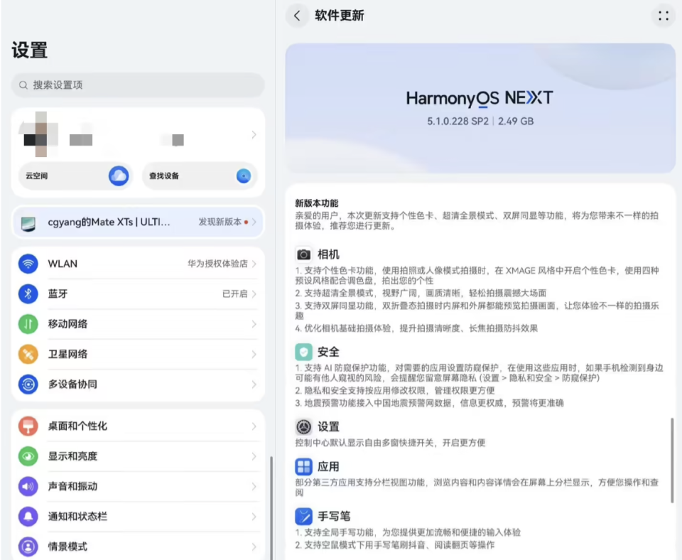 不过从从全局手写到AI防窥,从超清全景到双屏同显,华为Mate XTs的这次更新,绝非简单的功能堆砌。