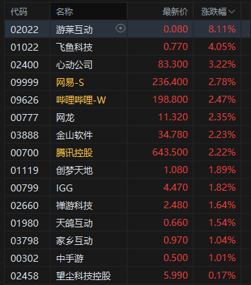 手游股走强,游莱互动涨超8%。Sensor Tower发布2025年8月中国手游产品在海外市场收入及下载量排行榜。点点互动旗下《Kingshot》8月收入再度劲增26%,强势登顶出海手游收入增长榜。网易于8月28日推出首款《命运》IP正版科幻射击手游《Destiny: Rising》(中文:《命运:群星》),自上线以来该游戏迅速引爆全球市场,凭借《命运》IP的影响力、极致的美术表现、深度策略玩法与沉浸式叙事体验,连续多日霸榜美国iOS手游下载榜榜首,成为2025年最受瞩目的新晋爆款,仅上线4天便入围8月增长榜第10名。另外,腾讯控股 《PUBG MOBILE》蝉联出海手游下载榜亚军。